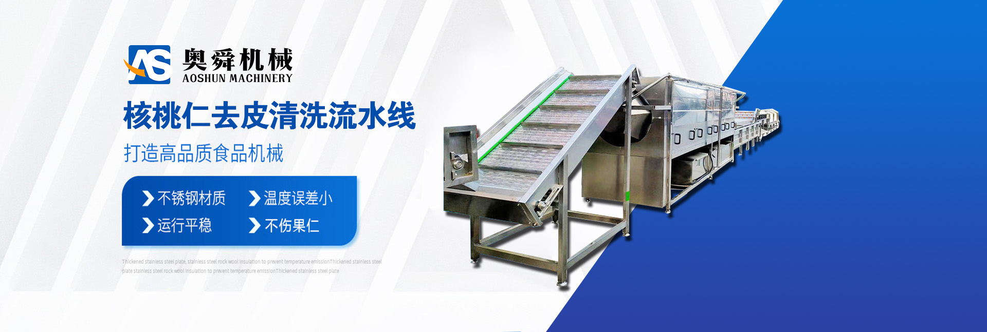 山東奧舜機械科技有限公司是一家生產食品機械的民營企業,制造環保機械、食品生產流水線。市場覆蓋全國,并出口多個和地區。 我公司以做好產品質量為宗旨,按照“以效益為核心,質量為主題,管理為主線,技術創新為動力,靠質量求生存,靠品種闖市場”的思路,確保過硬的產品質量和良好的公司信譽。以其優良的品質、精致的設計、精良的制造、精心的服務贏得廣大新老用戶的信譽,向社會提供更加和完善的產品與服務。